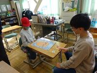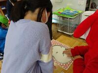 お正月が近いので、福笑いを使って顔のパーツの学習をしました。目かくしをした友達に、アシスタント役の子が説明をしながらパーツを渡します。「右のまゆ毛です。」頭の中でパーツの位置を想像しながら置いていきます。「次は鼻です。」だんだん顔が整ってきました。目かくしを外して見てみると・・・「わあ~!!」個性のある顔に歓声があがりました。