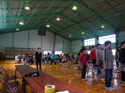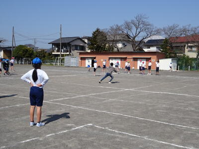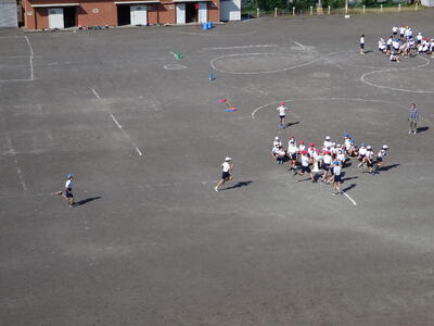 東小の運動場は、朝方まで降っていた雨を急激に吸い込む「スーパー速乾性」です。2時間目は5年生が体育の授業をし、シェイクアウト訓練もしっかり行いました。