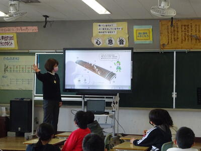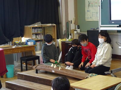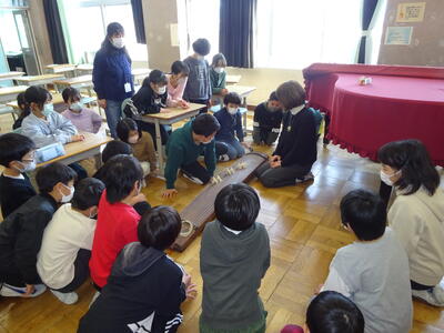 4年生の音楽の授業です。琴の演奏を聴いてから、実際に琴に触れ、弾く体験をしていました。
