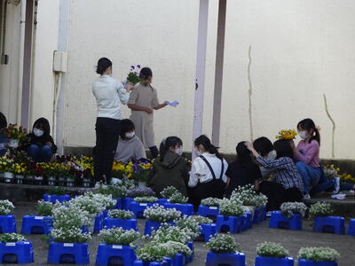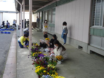 玄関前の花です。担当や園芸委員が、水やりや手入れをしているので、次々と花を咲かせています。