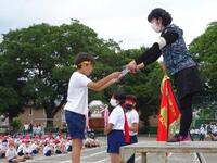 昨年度の優勝杯が返還され、校長より子供達や保護者の皆様に向けて熱いメッセージがあり、聞いている東っ子の表情は紅潮していました。