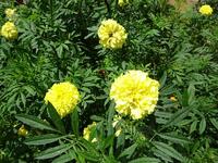 閉庁日開けの東小です。マリーゴールドが太陽に向かって、大輪の花を咲かせています。校舎と校舎の間から見える空はとてもきれいです。