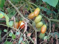 花壇のホウセンカ、畑のミニトマト、フェンスにつるを伸ばしているツルレイシ(苦瓜・ゴーヤ)。暑くてもたくましく花や実を付けています。