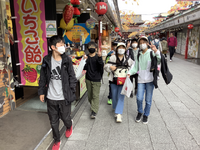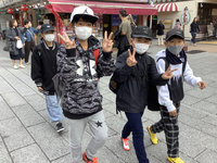 浅草でしばし買い物タイムです。人形焼や小物を買う子が多いです。時間通りに集まってきました。このあと体験に向かいます。