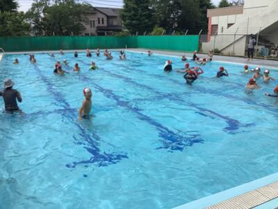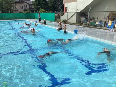 みんな水泳が大好きなようで、ワニさん歩きをしたり、ペアでお水を掛け合ったりと楽しく活動しました。