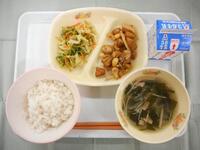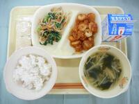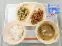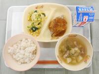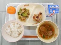 麦入りごはん 牛乳 鶏肉のピカタ 小松菜とツナのごま和え ワンタンスープ