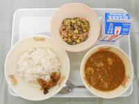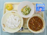 麦入りごはん 牛乳 ビーフカレー 福神漬 フレンチサラダ いちご