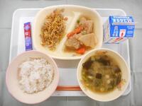 わかめごはん 牛乳 肉じゃが 豆腐と小松菜のみそ汁 アーモンドフィッシュ