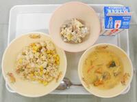 麦入りごはん 牛乳 鶏そぼろ入り厚焼玉子 ビーンズサラダ 豚汁