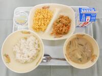 スタミナ丼(麦入りごはん・スタミナ丼の具・炒り卵) 牛乳 みそ汁