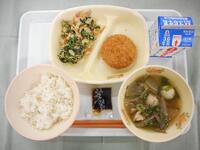 麦入りごはん 牛乳 さわらと大豆のナッツ和え おひたし みそ汁