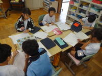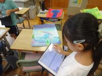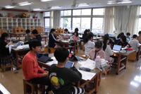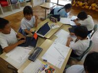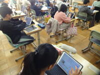 4年生は面積の勉強をしていて、長方形と正方形の面積を求める公式まで学習しました。今日はL字型(組み合わせた形)の面積を求めます。タブレットを使って個人で求め方を複数考えた後、グループで紹介し合いました。自分のタブレットを見せながら考え方を話し、似た考えや付け足しの意見などを共有していました。