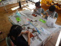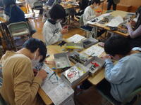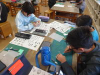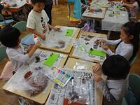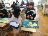 教室の中に、なんとも不思議な花がたくさん咲いていました。4年生ができあがった作品の鑑賞しているところです。友達の作品のよいところを見付けたり、自分が工夫したところを友達に伝えたりして交流していました。