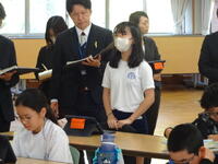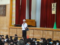 今日から2日間、北中学校の2年生3人が職場体験に来ています。1年生、3年生、4年生の各クラスで先生のお手伝いをしたり子供たちと遊んだりしています。昼の時間には、6年生に対して北中学校の紹介をしてくれました。