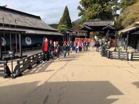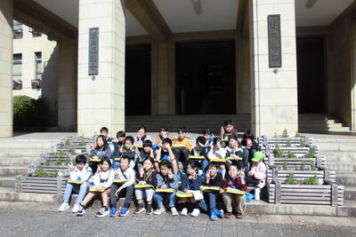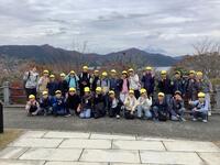 御休所や建物内の中央広場などの見学を終え、外に出ると、パラパラしていた雨が上がり、よい顔で集合写真を撮ることができました。