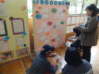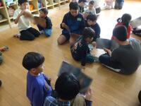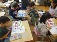 1年生が国語の授業で話合い活動をしていました。今までの授業で、自動車の「しごと」と「つくり」について押さえてきたので、今日は「はしご車」についてみんなで「しごと」とそのための「つくり」について考えました。付箋を使って意欲的に話し合っていてすばらしかったです。
