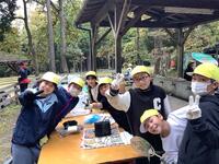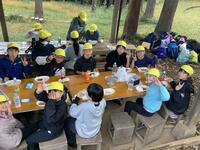 お昼のお弁当をを食べて、片付けた後、いよいよ「飯ごう炊さん」に挑戦です。所員の方に教えていただいた方法で、火をおこしました。「中ぐらいのまき、ちょうだい!」「まきの組み方これでいい?」みんなで協力してチャレンジしています。おいしくできるかな?!ワクワクドキドキです。