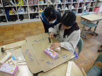 3年生が金づちを使って、木に釘を打ち付ける授業を行っていました。木材をうまく組み合わせたり、釘の高さや角度を工夫しながら打ち込んだり、試行錯誤しながら集中して作業に取り組んでいました。工夫を凝らした作品がたくさんできていました。