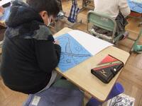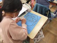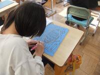 4年生が、図工の授業で「版画」を行っています。版画板に、マジックで図案を描きました。彫刻刀を使うのは、初めてです。それぞれの刃の使い方を、学習しました。今日の授業は、自分が版画板に描いた線に沿って、彫っていきます。緊張してやっていました。