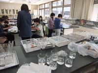 4年生が理科室で、実験を行っていました。熱の伝わり方を学習しています。鉄の棒にロウを塗り、端をカセットコンロ(火)で熱します。ロウの溶け方を観察し、熱の伝わり方を調べます。どの子も真剣な表情で、実験に集中していました。