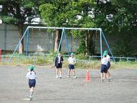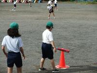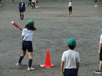先月、宇津木妙子氏にご来校いただいた際、日本ソフトボール協会から「アソボール」を4セットいただきました。アソボールは、写真のようにコーンの上にボールをのせて、バットで打ちます。後は、野球やソフトボールを同じように1塁に走り、ホームまで来れば1点になります。だれでも手軽に楽しむことができ、この日は4年生が授業を行っていました。歓声が上がり、盛り上がっていました。