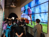 大好きなエヴァンゲリオンをじっくり見ています。館内のミニチュアの中に、加藤先生がいます。子供たちがここだと思う場所でさがしていますが、見つけられたかな。