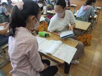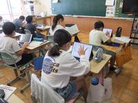 6年生が算数で、円の面積を学習しています。学習も進んで、今日の授業は、円を組み合わせた形や、四角形の中に円が入った形の面積など、様々な形の面積を求めていました。自分の考え方を他の友だちに伝え、友だちの考えも聞いて、学びを深めていました。