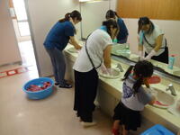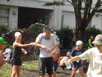 なかよし学級のみなさんが、中庭で水遊びを楽しみました。水鉄砲で的をねらったり、お友達と水をかけ合ったり、中庭に笑顔と笑い声が広がっていました。先生たちも一緒に水をかけたりかけられたり、びしょびしょになっていました。