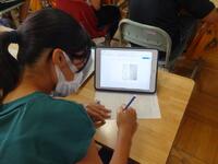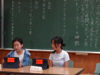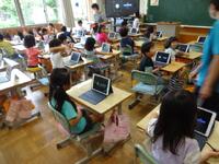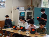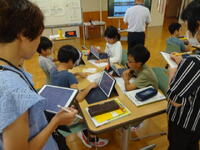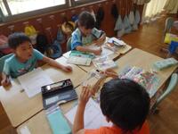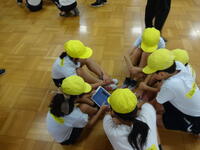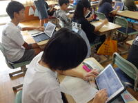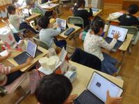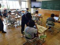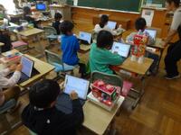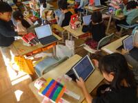 1年生の図工「はこでつくったよ」の学習です。自分の作品をタブレットで撮影して、アプリ(メタモジクラスルーム)に貼り付け、そこに振り返りを書いていました。キーボードを使った入力はまだ難しいので、手書きして文字に変換する方法で入力しています。自分の振り返りができると、お友達の作品を撮影して、よいところを書き込んでいました。1年生もタブレット操作にだんだんと慣れてきました。
