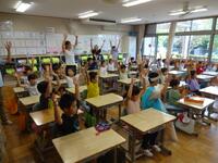 1年生がALTの先生と一緒に英語の勉強をしていました。楽しそうに色カードを取り合うゲームをしながら、色を表す英語をしっかりと確認することができました。