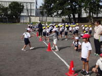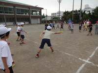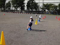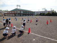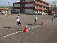 1年生が体育の授業で「リレー遊び」を行いました。コーンを回ったり、小型ハードルを飛び越したりと障害物も乗り越えて、リレーをしていました。途中で、どうしたらもっと早く走れるのかをみんなで考えて練習をしました。待っている間の応援も大切だと意見が出て、一生懸命応援もがんばりました。