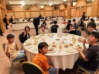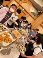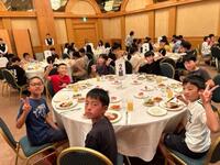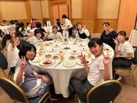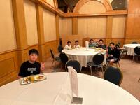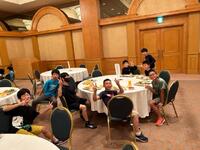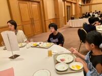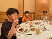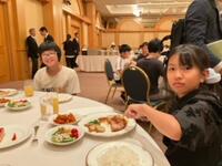 部屋に荷物を置くと、次は待ちに待った夕食です。夕食会場に集まると、目の前の料理に笑顔があふれます。ジュースで乾杯して、おいしくいただきました。
