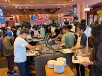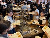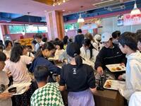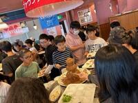 まずは腹ごしらえということで、バイキングレストラン「ラ・タラフク」へ。好きなものをたっぷりとお皿にのせて、うきうき笑顔です。チョコレートファウンテンにも人が集まっていました。