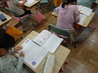 1年1組さんが図書室で本を読んでいました。面白そうな本を見つけては、本の世界に入り込むように集中して読んでいます。新しい本を借りて教室に戻ると、記録カードを書いたり、さっそく読み始めたりと意欲的に取り組んでいました。
