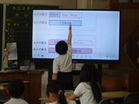 算数の授業です。2本のゴムはどちらがより伸びたのかを子供たちが話し合っていました。どちらのゴムも100cm伸びているので、伸びた長さは同じなのですが、もとの長さが違っています。そこに視点を向けて、もとの長さのいくつ分伸びているかを確かめ、2倍と3倍の違いに気付きました。電子黒板の図を使いながら、一生懸命自分の考えを説明する姿が見られました。