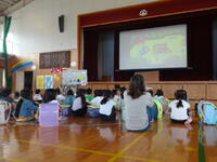 先週の金曜日に引き続き、今日の昼休みも読み聞かせボランティア「ちちんぷい」さんによる読み聞かせがランチルームで行われました。1年生やなかよし学級のみんさんなどが集まってお話を聞きました。前回もそうだったのですが、小道具や音楽をうまく使って、お話の世界を表現してくださったので、みんなお話の世界にひたることができました。