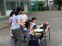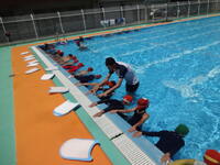 水着の上に普段着を身にまとい講習を受けます。目的は「浮くこと」です。さまざまな方法で浮く練習をしました。ライフジャケットを着ているとき、ペットボトルを持っているとき、ビニル袋に空気をためて浮く方法、何も持たずにどうやって浮くことができるかと丁寧に教えていただきました。脱力ができている人は何も持たずにかなりの時間浮くことができていました。講習会を終えて、「楽しかった」「勉強になった」と満足した様子が見られました。もしもの時に備えて、とてもいい経験ができたと思います。