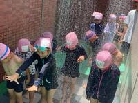 昨日の大雨から一転、素晴らしく晴れ上がった青空の下、1年生が水遊びを行いました。先日のプール開きに続けて2度目のプールです。