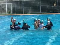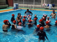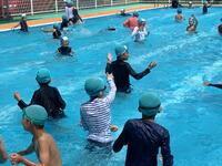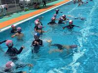 みんなで、水中どろけい(鬼ごっこ)などをしながら、少しずつ、体を水に慣れさせてていくようです。