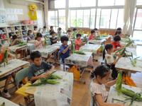 今日は2年生が給食で提供されるとうもろこしの皮むきをお手伝いしてくれました。まずは先生たちから、やり方や注意を聞きます。次に、かご一杯のとうもろこしが配られ、一斉に皮むきのスタートです。子供たちはとうもろこしの観察をしながら、丁寧に一枚一枚皮をむき、ひげをとっていきます。あっという間にきれいな黄色の実が出てきました。今日の給食でおいしくいただきたいと思います。2年生の皆さん、ありがとうございました。