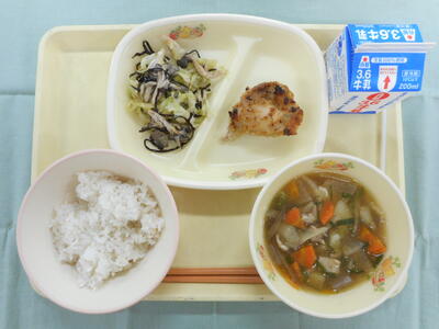 麦入りごはん 牛乳 鶏肉のごまみそ焼き キャベツとしめじの昆布和え 具だくさん汁