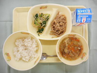 麦入りごはん 牛乳 豚肉のソース炒め 煮びたし みそ汁 アーモンドフィッシュ