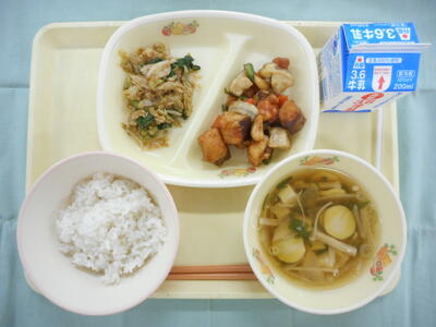 今日は十三夜にちなんだお月見献立です。十三夜には十五夜の次に美しい月が見られるといわれています。給食では月とうさぎをイメージしたかまぼこをいれたすまし汁を作りました。また主菜の揚げ煮は今の時期においしい「さけ」や「さといも」が主役です。季節のおいしい食材を味わって食べましょう。