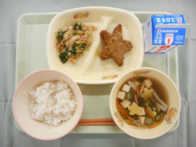 7月7日は七夕です。今日は一足早い「七夕献立」です。星の形をしたかわいいハンバーグがポイントです。七夕汁には切り口が星に似ているオクラと星の形のかまぼこが入っています。給食でも七夕を感じてくださいね。