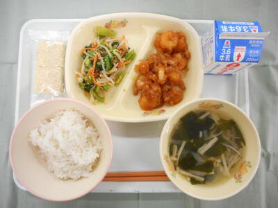 麦入りごはん 牛乳 エビのチリソース ナムル おこげ入り中華スープ