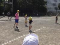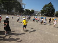 1年生と2年生が、それぞれ対戦しました。フリスビーを使用したドッジボールなのですが、王様が当たってしまうとその場で負けが決まってしまいます。実際に王様を当てて1年生が勝つ場面がありました。みんな、楽しく遊ぶことができました。