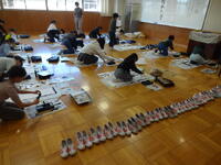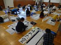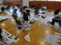 4年生が2階の北っ子ホールで書き初めの練習をしていました。みんなで広がっても、十分なスペースが確保できるのでとても助かります。書くために上履きが邪魔だと、みんな上履きを脱いでいたのですが、きれいに整頓されていました。心が整っているといい作品が書けそうですね。