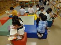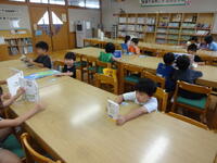 1年1組さんが図書室で本を読んでいました。面白そうな本を見つけては、本の世界に入り込むように集中して読んでいます。新しい本を借りて教室に戻ると、記録カードを書いたり、さっそく読み始めたりと意欲的に取り組んでいました。
