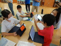 1年生の図工「はこでつくったよ」の学習です。自分の作品をタブレットで撮影して、アプリ(メタモジクラスルーム)に貼り付け、そこに振り返りを書いていました。キーボードを使った入力はまだ難しいので、手書きして文字に変換する方法で入力しています。自分の振り返りができると、お友達の作品を撮影して、よいところを書き込んでいました。1年生もタブレット操作にだんだんと慣れてきました。