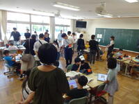 予想外の暑さで、体調を崩した子がいたり予定より遅れてしまった班があったりしましたが、全員が学校に到着して、終わりの会をランチルームで行い、代表者が気付いたことや感想を発表しました。